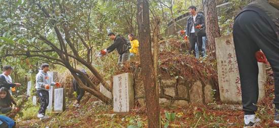 来到三位地质先辈坟前,学院老师们先是带领学生会代表为地质先辈除去坟地周围的杂草。然后在三位地质先辈坟前为学生们讲述了1944年4月23日许德佑、陈康及马以思三位先辈在贵州晴隆罐子窑工作期间路遇土匪被害惨死的事迹。