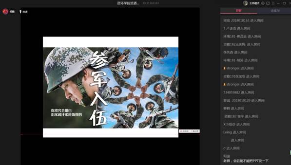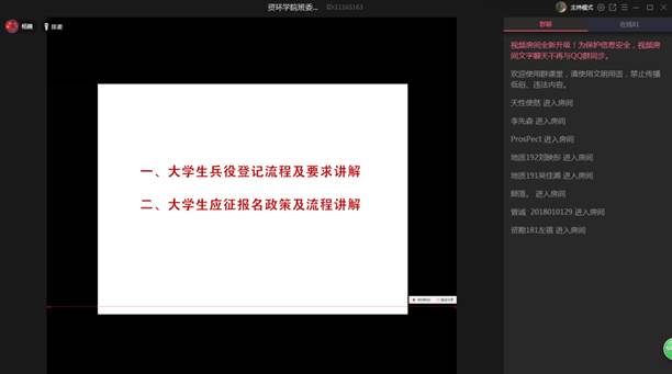 (本网讯图/文 李刚)为响应党和国家的号召,激发大学生参军热情,鼓励大学生参军入伍,3月27日下午,资源与环境工程学院通过QQ课堂的方式线上召开了2020年上半年大学生参军入伍宣传会,宣传会由杨巍老师主讲,学院副书记梁珍、李刚老师及全院80余名团干班干和有志参军的同学参加了此次宣传讲座。