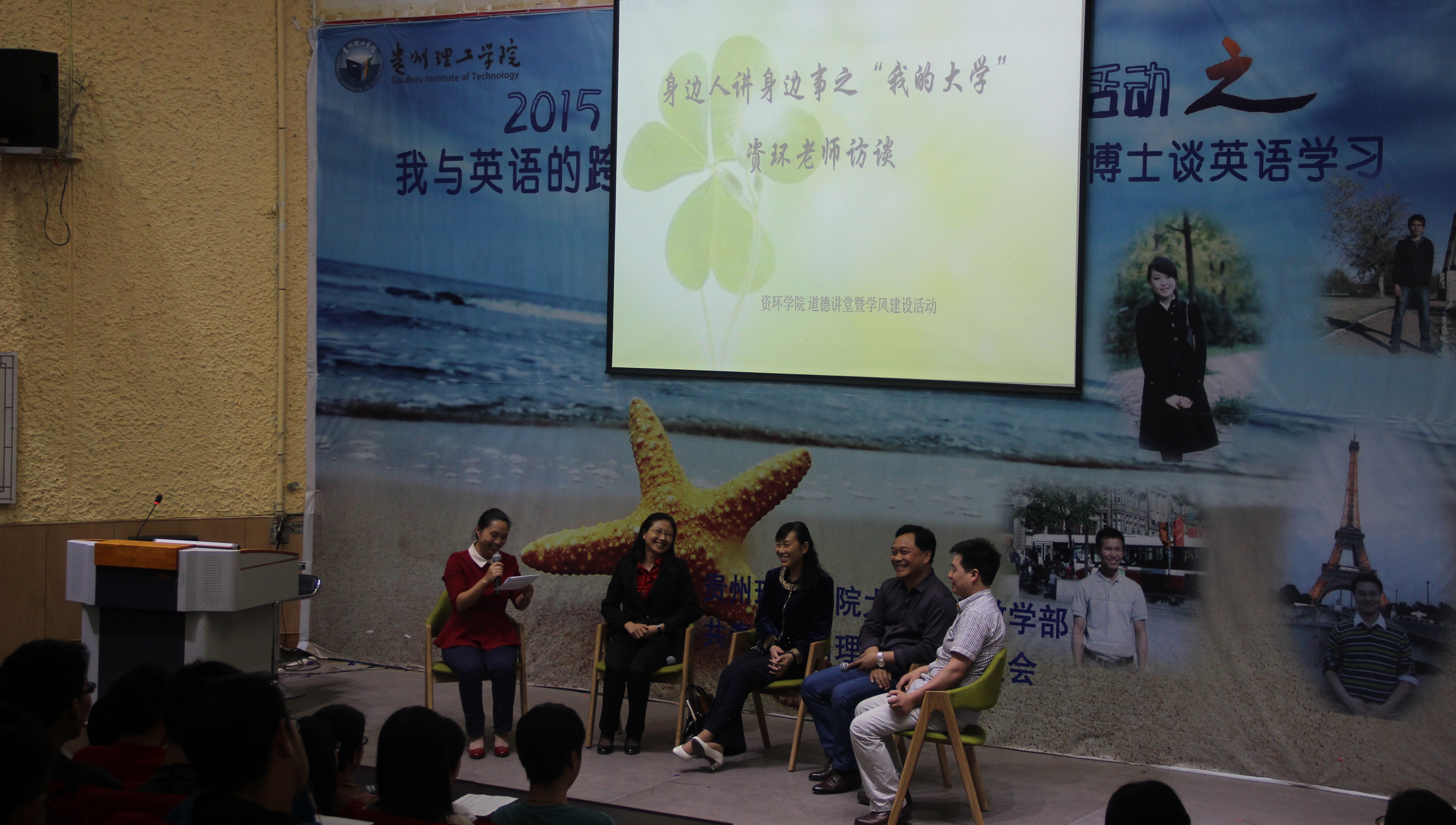 为了激发同学们对大学生活的正确认识、提高学习兴趣,建立起坚定的理想信念。2015年5月15日星期五下午14:00,资源与环境工程学院在逸夫学术报告厅开展道德讲堂暨学风建设系列活动第二期——身边人讲身边事之“我的大学”资环老师访谈活动。此次访谈活动邀请到的嘉宾有资环学院党总支刘幼平书记、聂爱国院长、党总支潘福炎副书记、李桂贤副院长、学院办公室主任吴开慧老师、团总支副书记张双菊老师、辅导员陆艺老师以及任课老师刘坤博士,访谈活动由张双菊老师主持。