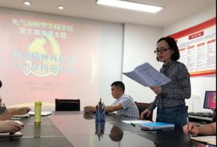 本网讯(电气与信息工程学院 杨滴)2019年7月12日下午,电信学院两支部在行政楼723会议室开展“庆祝建党98周年.践行初心使命”主题党日活动。学院党总支书记王婷婷为全院师生党员上了一堂题为:“提振精神再前进,斗志昂扬迎评估”的党课。