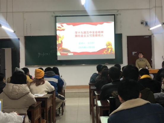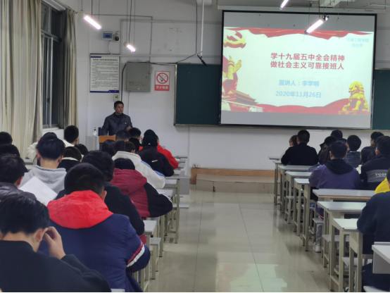2020年11月26日晚19:00,交通工程学院党总支书记李学明为交通工程学院19级全体同学、17级和18级正式党员、预备党员、入党积极分子做了“学十九届五中全会精神 做社会主义可靠接班人”党课宣讲。李学明书记就进一步深入学习贯彻落实五中全会精神,抓好学校当前工作强调三点:一是要抓好学生的学习,提升学生知识文化水平。坚实的文化水平是强国的基础。要全面落实学习贯彻五中全会精神,交通工程学院学生应刻苦学习,在我们所学知识内实现交通强国,为国家的建设贡献自己的一份力量。二是抓好高校教育工作。今年突发的疫情,党和国家沉着有力的应战,统筹新冠肺炎疫情防控和经济社会发展工作等各项工作和事业取得新的重大成就中更加坚定理想信念和我们的决心,紧跟党的步伐。在高校内的我们要落实“三个更加”和实现教育兴国,提高大学生教育水平和毕业条件,保证大学生学到实际的知识,实现真正的教育兴国。三是贯彻新理念。“十四五”规划和二〇三五年远景目标是新发展理念的规划版,也是中国特色社会主义政治经济学的施工图。要在教育内涵、外延、工作举措上推进新发展理念的具体化和全面落实。